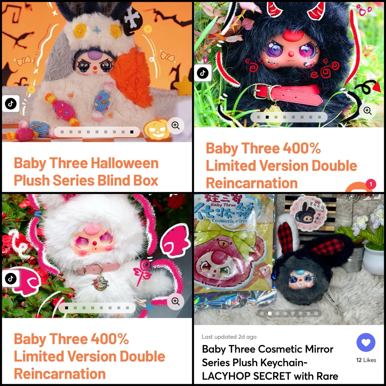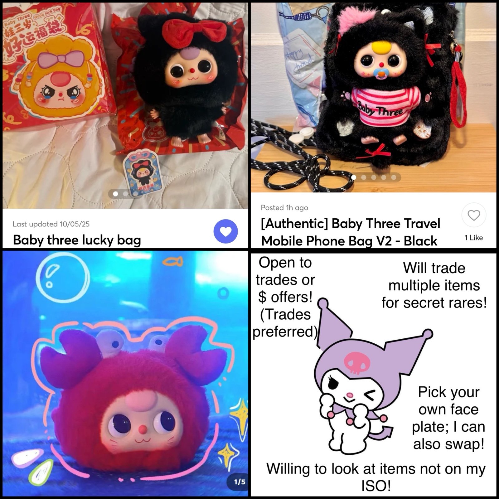 This is to show all the Baby Three items I own. If you’d like a body without a faceplate, you can pick a faceplate from the 2nd picture! I can also swap out face plates too. I’d ideally like to exchange one or multiple plushies for items on my ISO list- but am open to buy offers as well! DM me a price with what you want and we can negotiate. <3 Also open to looking at other items that aren’t on my ISO list. :)