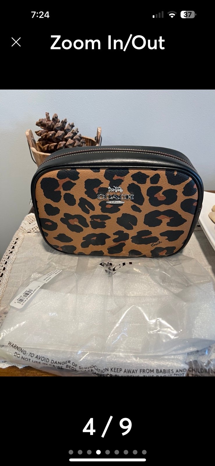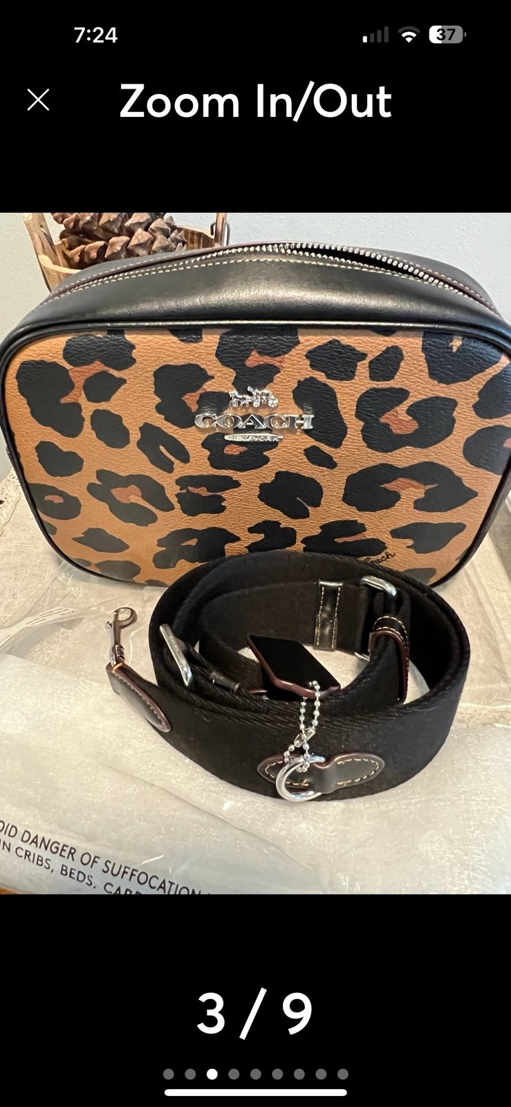 Signature coated canvas printed coated canvas and smooth leather Inside multifunction pocket Zip closure fabric lining Outside open pocket Detachable strap with 21 3/4 drop for shoulder or crossbody wear 9 1/2 (L) x 6 1/4 (H) x 2 3/4 (W) Style No. CC759 | Coach Outlet Jamie Camera Bag With Signature Canvas And Leopard Print - Brown