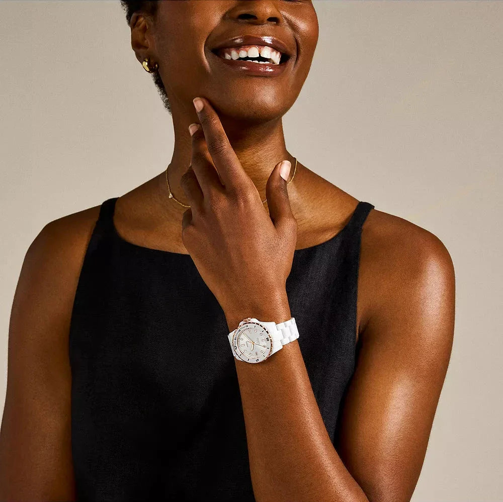 This Fossil FB-01 watch features a crisp white dial and a sleek ceramic strap, creating a stylish and versatile accessory for women. With its simple yet elegant design, this watch is perfect for any occasion and offers both functionality and fashion. Precision and sophistication in one.