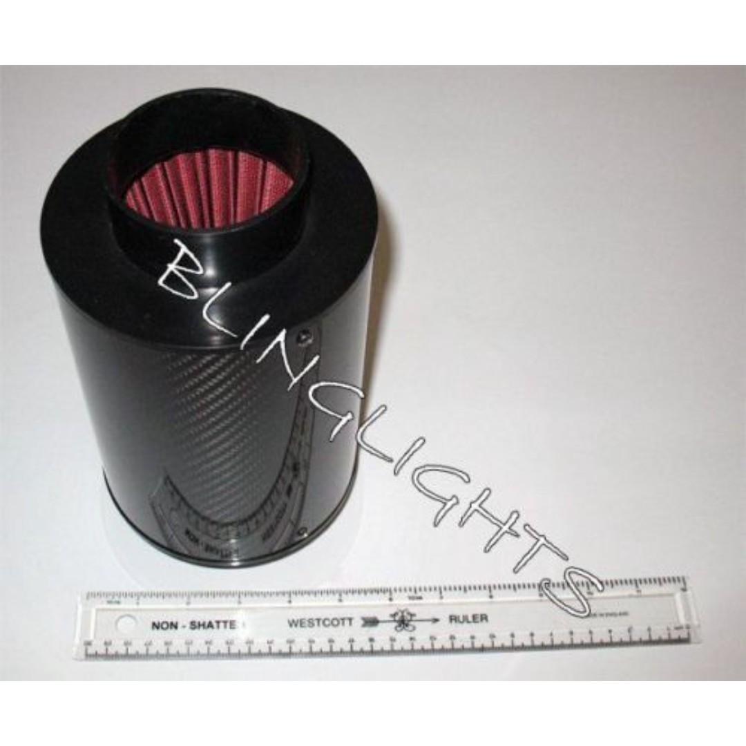 This listing is for the Carbon Fiber Filter Enclosure with Built In Filter, Extendable Vinyl Hose, Rubber Collar, Rings, Mount, Vacuum Line Connectors and Grommets and Directions. Listing does not include the Periscoop shown in the first customer photo. Compare BlingLights Brand to Name Brand and Save. Limited inventory, once sold out this model intake will be discontinued permanently. If you feel the product is in any way inferior to the name brand's Product Code: 0708JK-SNRKA send it back within 60 days for a FULL Refund. No questions asked! More Photos Available Upon Request Name Brand $299.95 BlingLights $99.77 + Free Shipping Save over $200! 100% Carbon Fiber with Clear Coat Finish Connects to SC 11" Long 6" Wide 3" Opening 3" to 3 1/2" Step-up