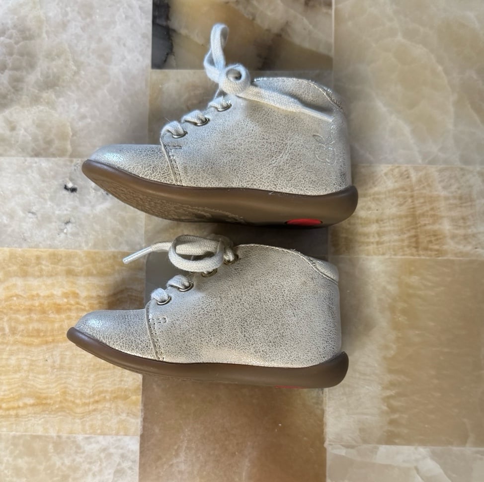 This lace-up first-walker shoe for children comes in a gold metallic leather version. Lightweight and featuring a rubber sole, this shoe is designed with quality materials for healthy foot development. An Anti-Twist reinforcement placed at the back of the shoe ensures optimal support and stability, while providing flexibility at the forefoot.