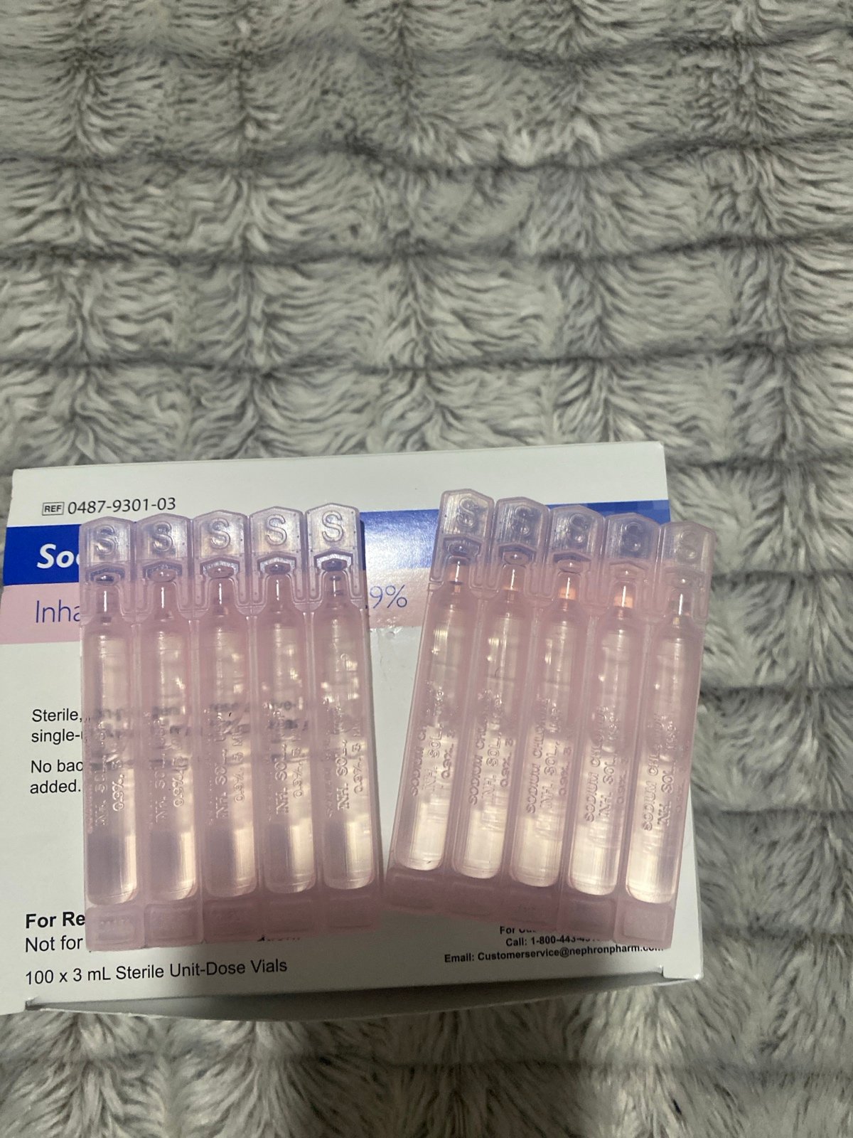 This listing is for a Box of Sodium Chloride Inhalation Solution, USP 0.9%, 100 x 3 ml Vials Exp 12/31/2026. The single use vials are to be used with a nebulizer machine.