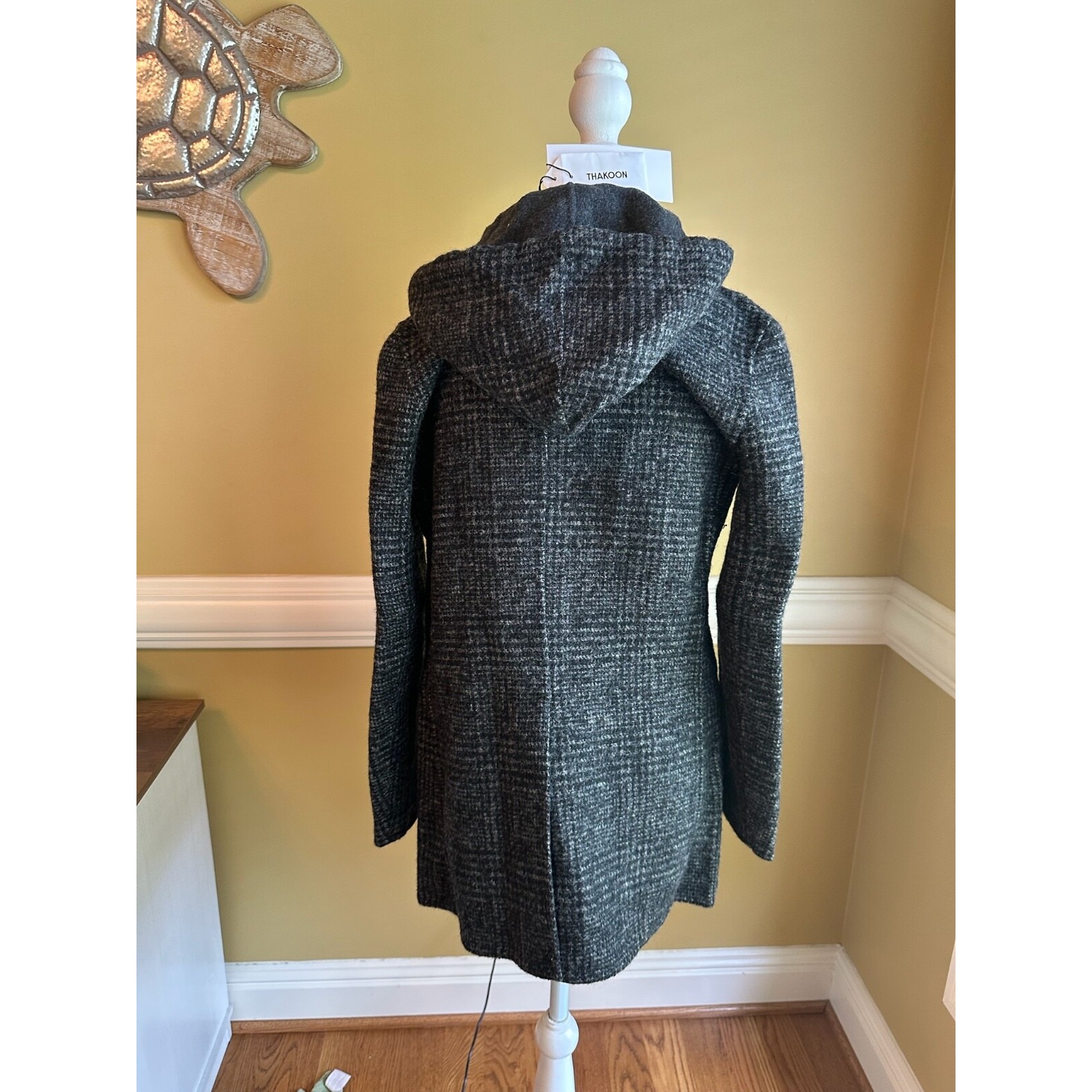 Stylish hooded tweed jacket, perfect for adding a touch of sophistication to any outfit. This coat features a classic checkered pattern, offering a timeless look, while the button-front closure provides a secure and comfortable fit. The hood adds an extra layer of warmth and style, making it a versatile piece for various occasions. Its well-constructed design and attention to detail make it a standout addition to any wardrobe, seamlessly blending fashion and functionality. The jacket also includes functional pockets and a tailored silhouette.