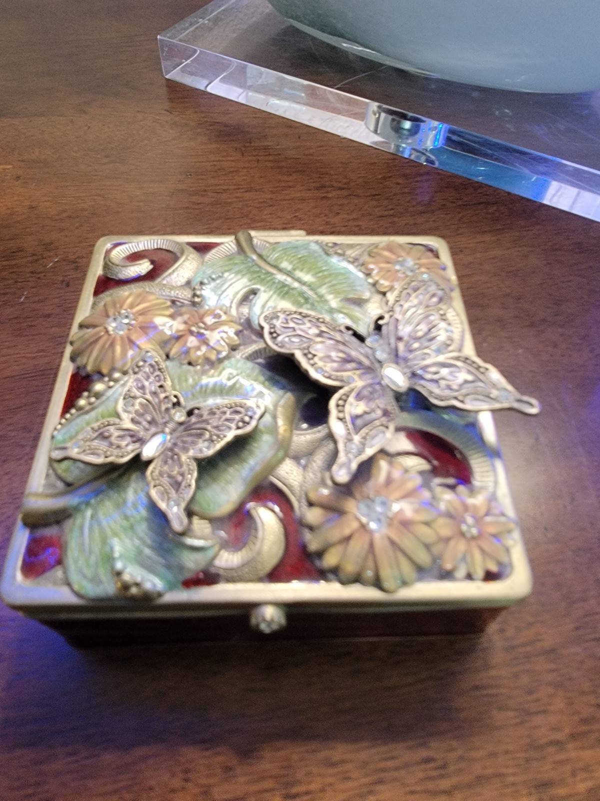 This is a beautiful green enamel and brass box with green leaves peach flowers and butterflies. The inside lid has a mirror. The box is lined with a removable black velvet lining. In excellent condition. Ready to ship.